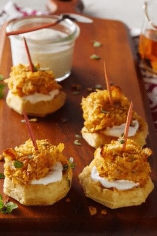 Line a baking sheet with foil; coat with cooking spray. Arrange the quartered waffles on the baking sheet; top with 1 teaspoon of the sour cream-maple syrup sauce. Place chicken on top.